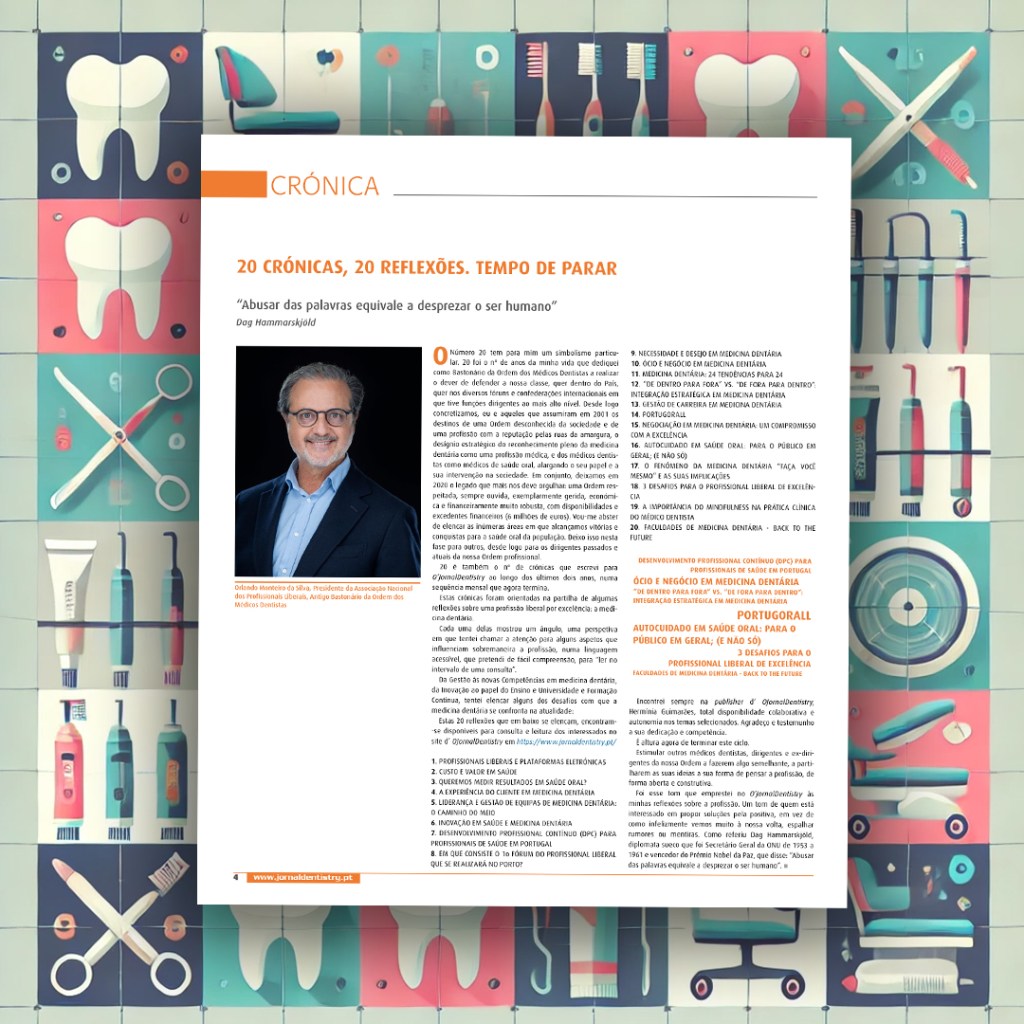 Foi esse tom que emprestei no O’JornalDentistry às minhas reflexões sobre a profissão. Um tom de quem está interessado em propor soluções pela positiva, em vez de como infelizmente vemos muito à nossa volta, espalhar rumores ou mentiras.