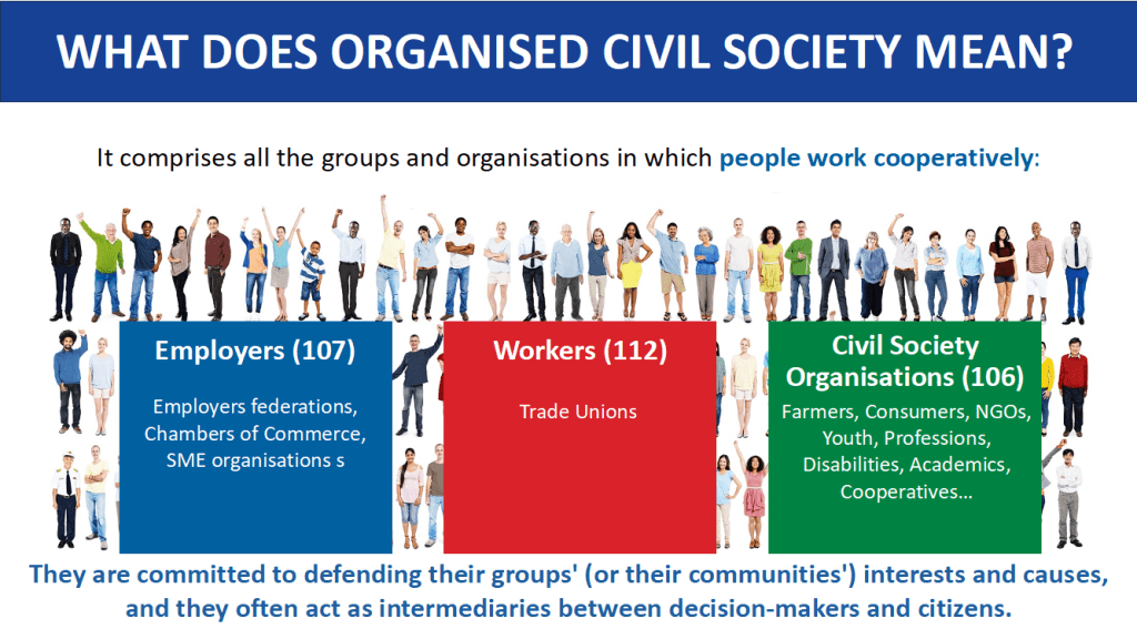 The Civil Society Organisations’ Group is one of the three groups that make up the EESC. Group III is made up of representatives and stakeholders of civil society, particularly in the economic, civic, professional and cultural field.