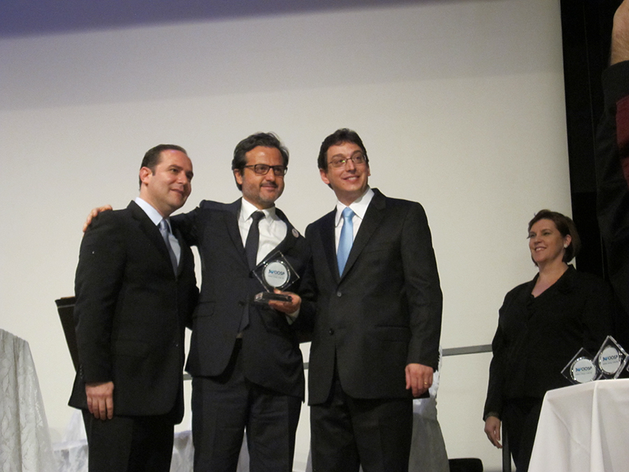 English: With the colleagues Carlos Alberto Battaglini (left), president of the organizing committee of the 30th CIOSP and Adriano Forghieri (right), president of the São Paulo Association of Dental Surgeons (APCD).