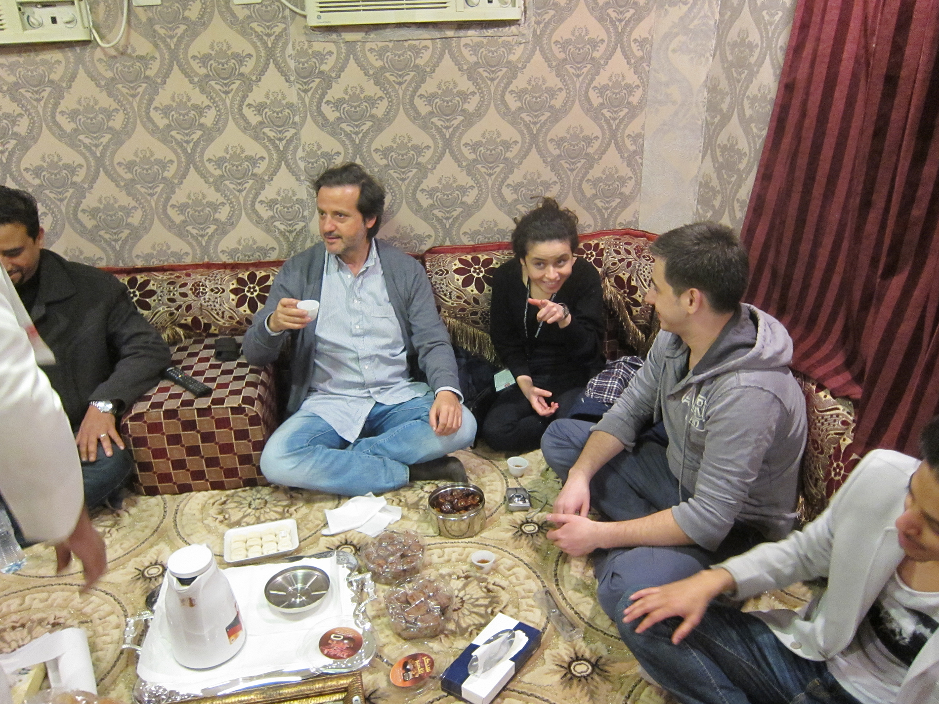Having tea in a tent in the desert.