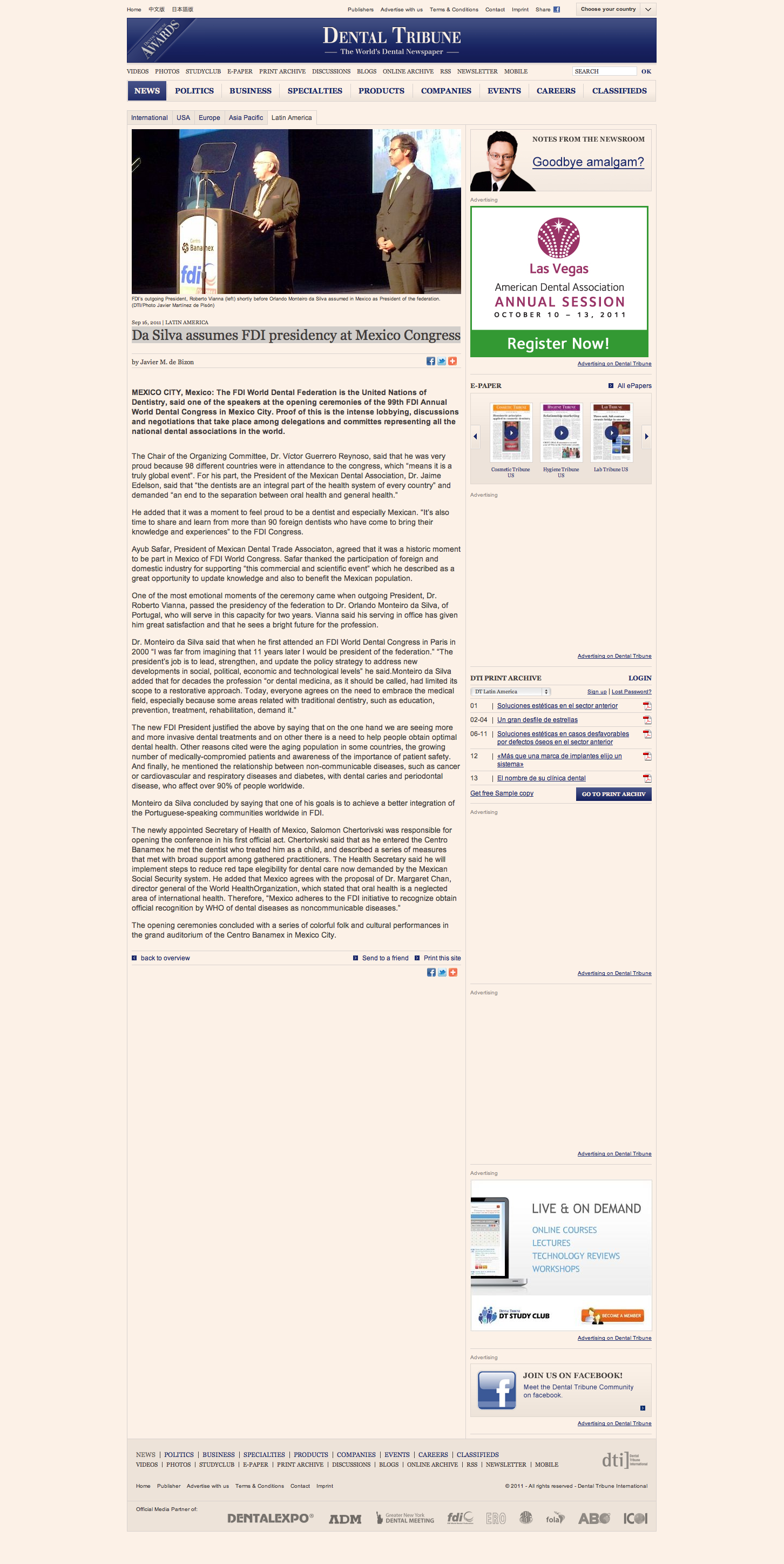 Repository of articles in the media about my taking office as president of the FDI World Dental Federation: